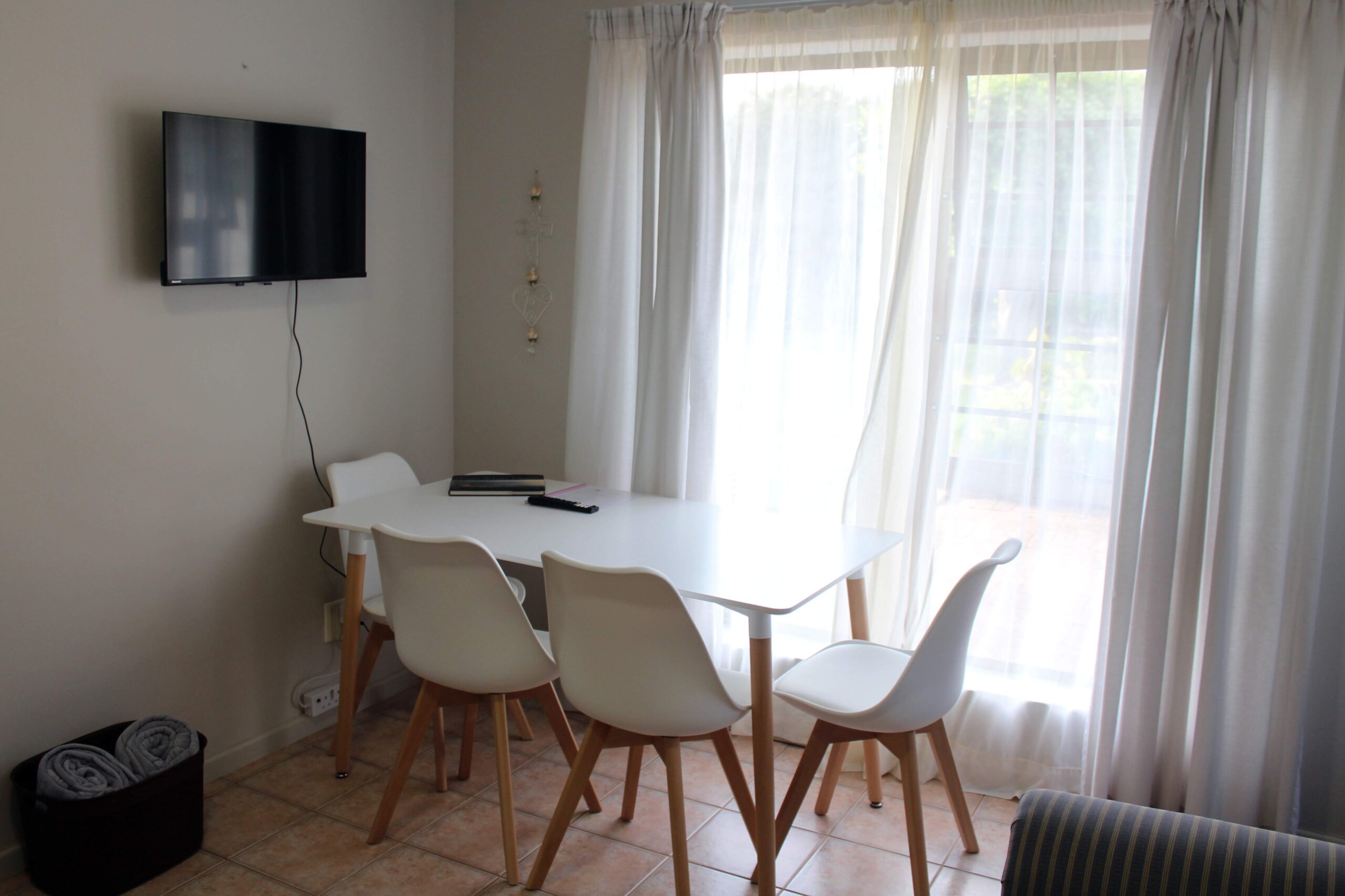 The open-plan living area includes a fully equipped kitchen with an air fryer, single-plate induction stove, microwave, kettle, fridge-freezer, and all necessary cutlery and crockery. A dining table with seating for 4 is perfect for shared meals. The lounge has a comfortable sleeper couch for children aged 12 and under, a smart TV for personal streaming, and free Wi-Fi.